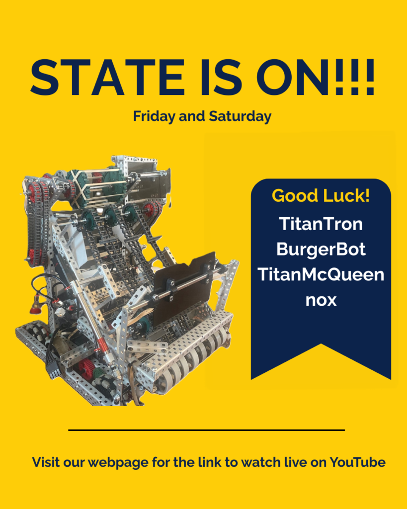 - Congrats!! TitanTron, BurgerBot, Titan McQueen, and nox for making the State Competition